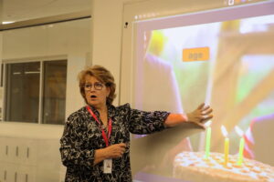 Maria uses music and dancing to unlock the many cultures that feed into the language of Spanish. Every class, she projects the lyrics and the class sings songs in Spanish. Having worked previously at a Catholic, all-girls private school, Maria laughs remembering how limited she used to be in what songs and lyrics she could play. “Music, the students really enjoy. I look for songs that we can sing. Singing, it sets the mood. Music sets the mood. It’s like magic.”